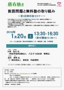 第5回無料塾セミナー開催のお知らせ。 Posted on 2017年12月15日 こんにちは、慈有塾です。 2018年1月20日(土)第5回無料塾セミナーを開催致します。 詳細は↓チラシをご覧ください。 皆様からのご応募お待ちしております。 不明点などありましたら。お気軽に→info【a】old.jiyujuku.net(【a】を@に変えて)ご連絡ください!